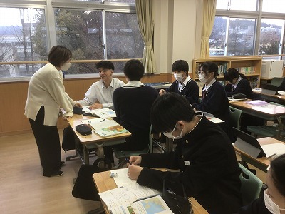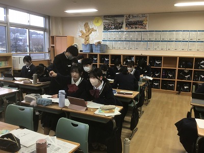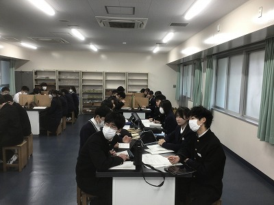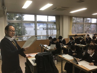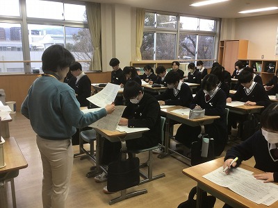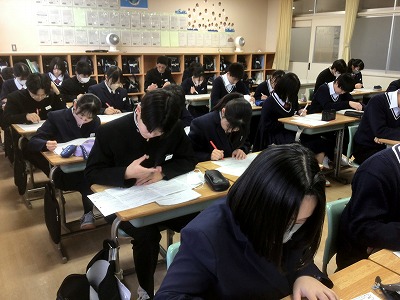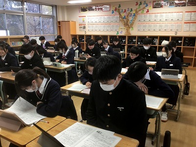1月13日(火)4校時に行われていた3年生の授業をのぞいてきました。 どのクラスも実力テストの返却をしていました。受験が目前に迫ってきて、結果を追い求めて焦る気持ちが大きくなるのがこの時期です。入試に向けて一生懸命な3年生の気持ちはよく分かります。しかし、少し見方を変えると、今回悔しい思いをした人は、まだ伸びしろがあるということでもあります。残された時間で課題となっている単元や問題を克服することができれば、学びが深まり、成長していくことができます。 そのように、今の自分に満足せず、最後の最後まで学力を伸ばし続ける人こそ、高校に入っても学び続けられる人だと思います。受験に向けて必死な3年生の姿を見ていると、「自分も頑張らないと!」というエネルギーをもらいます。